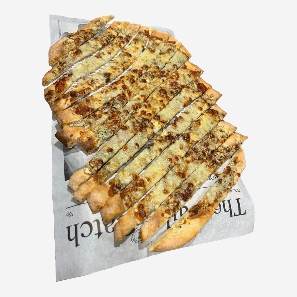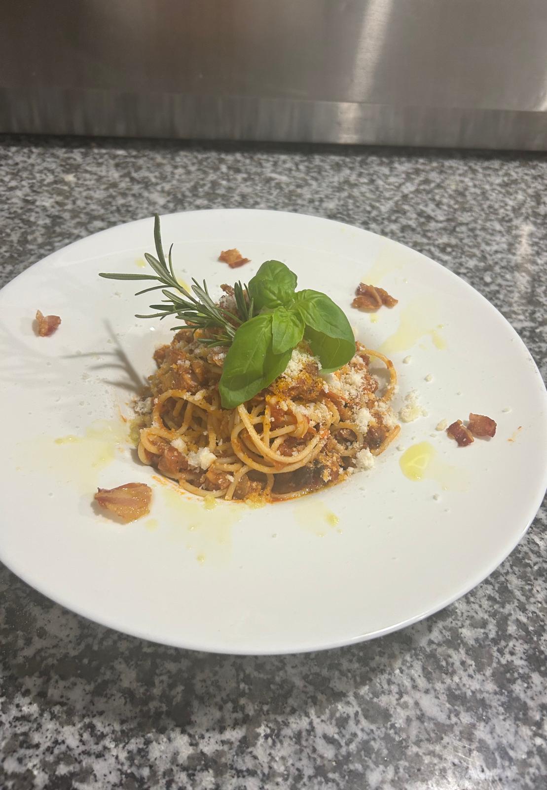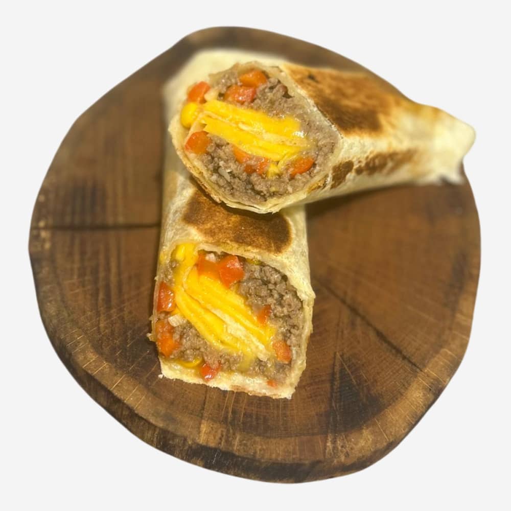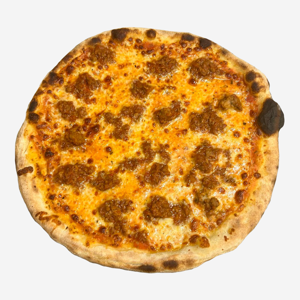 pomodoro, mozzarela, hovězí mleté maso, slanina, kozí rohy, čedarová omáčka, BBQ omáčka