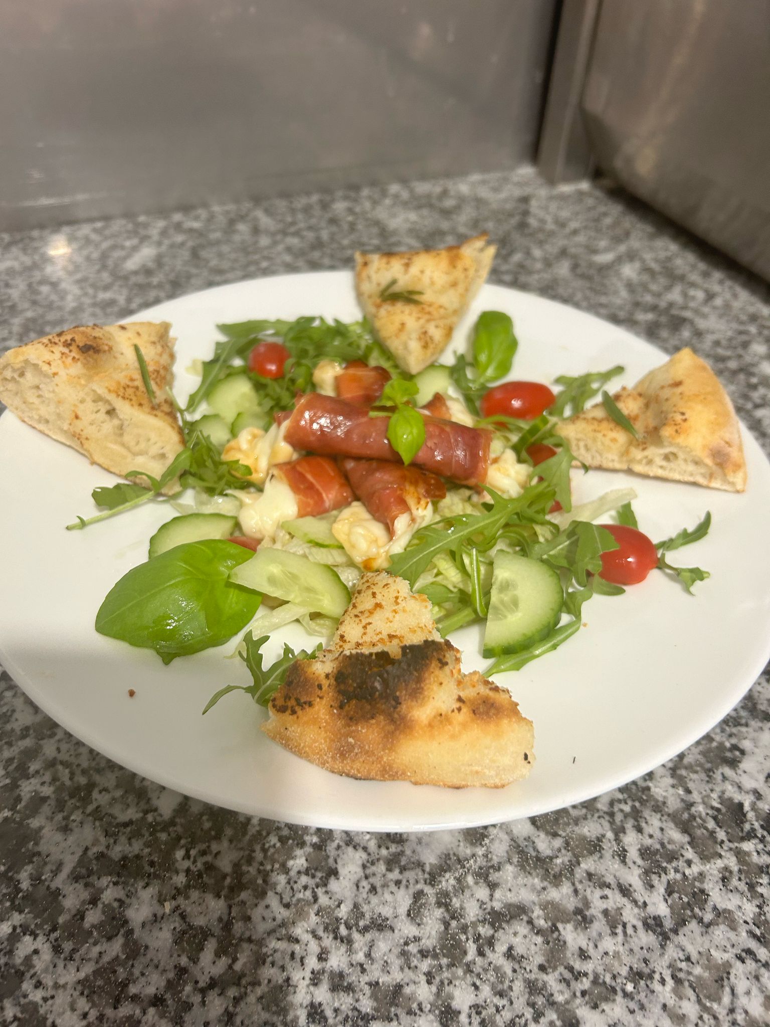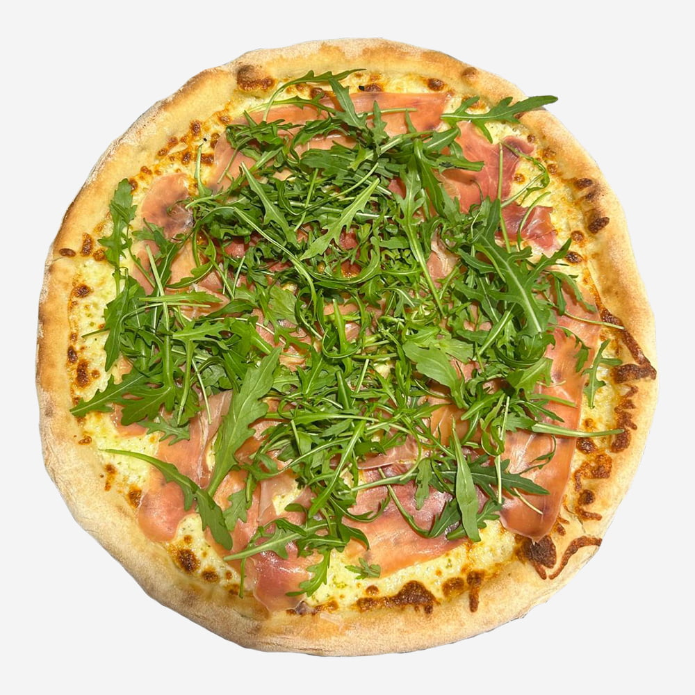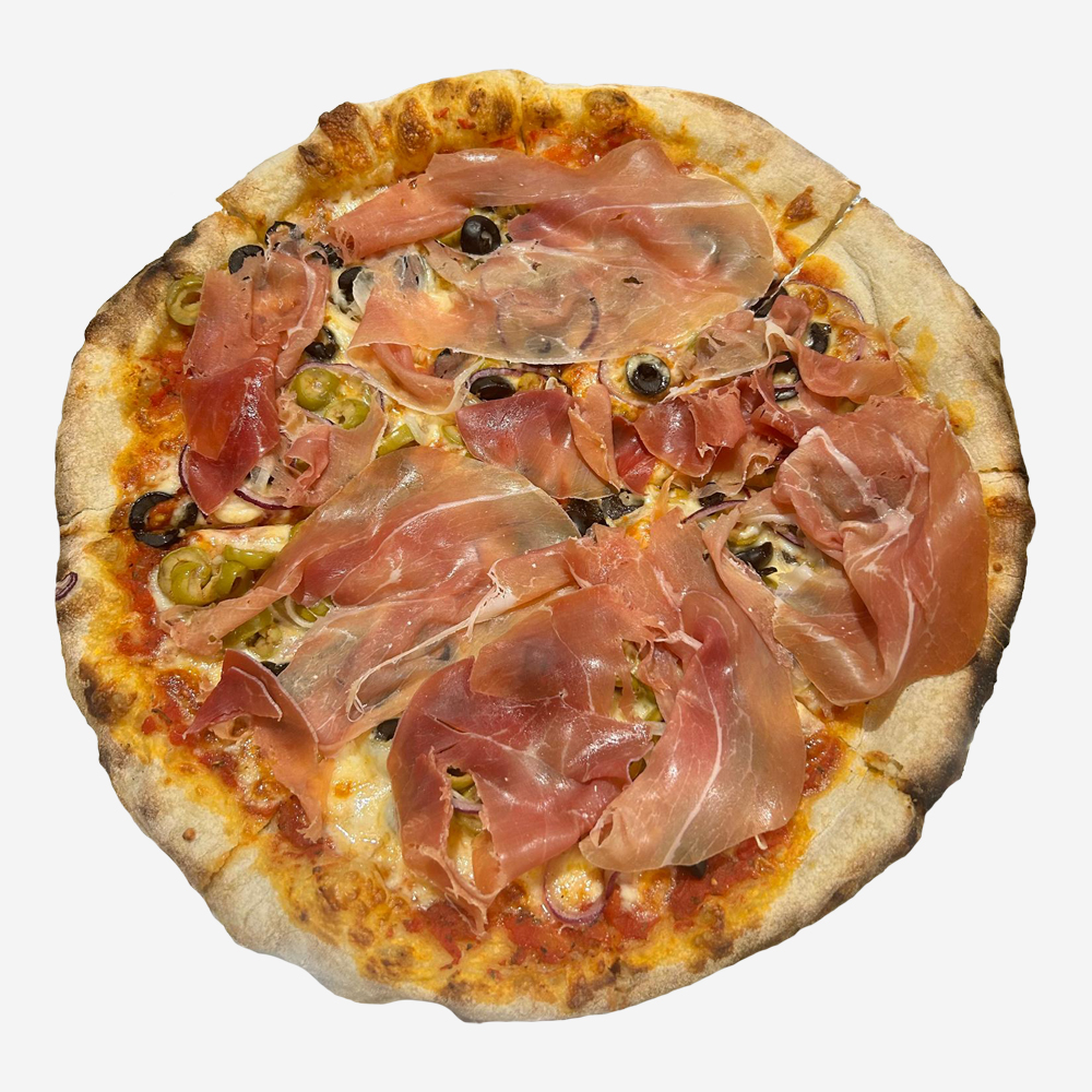 rajčata, mozzarella, parmská šunka, cibule, mix oliv, ⌀ 33 cm