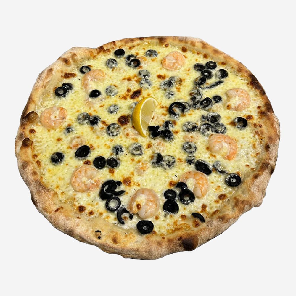 smetana, mozzarella, krevety, černé olivy, ⌀ 33 cm