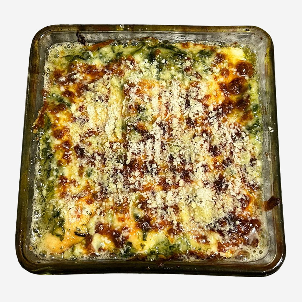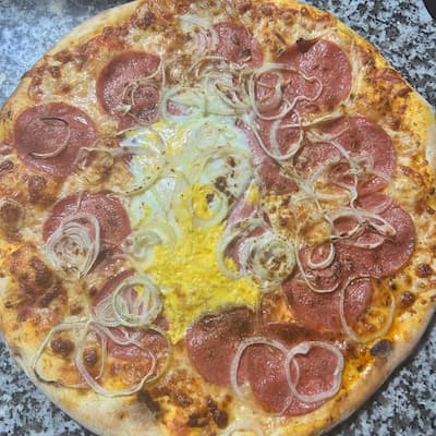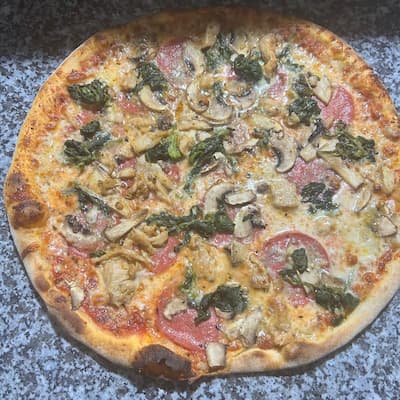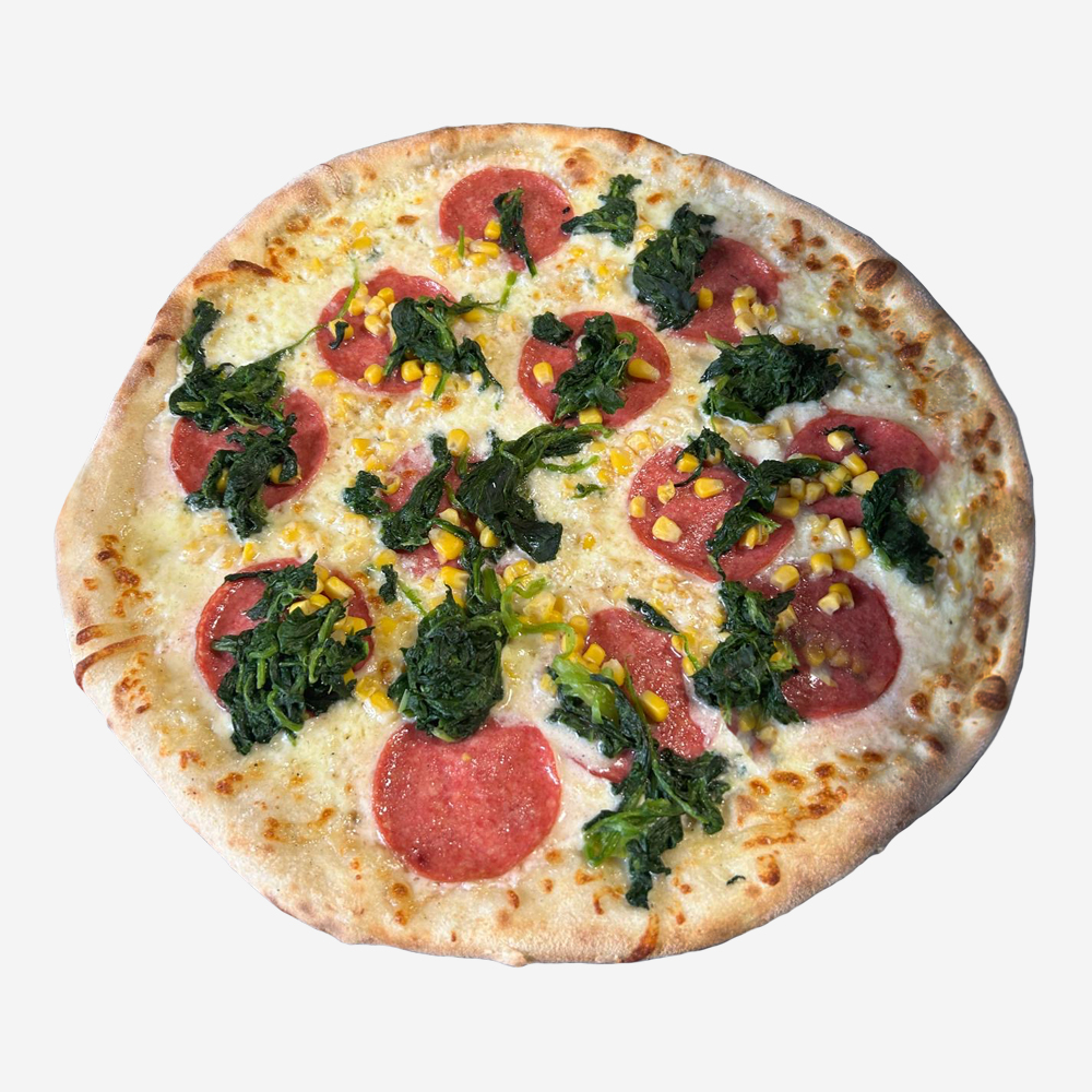 smetana, mozzarella, salám, špenát, kukuřice, česnek, ⌀ 33 cm