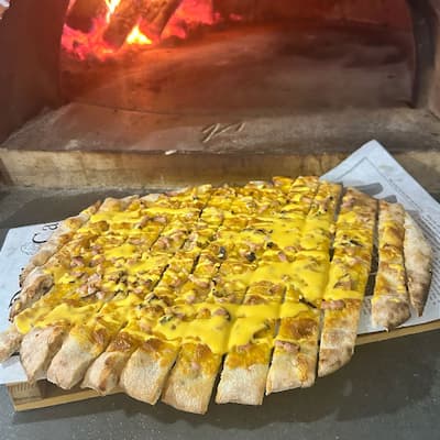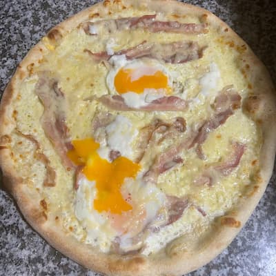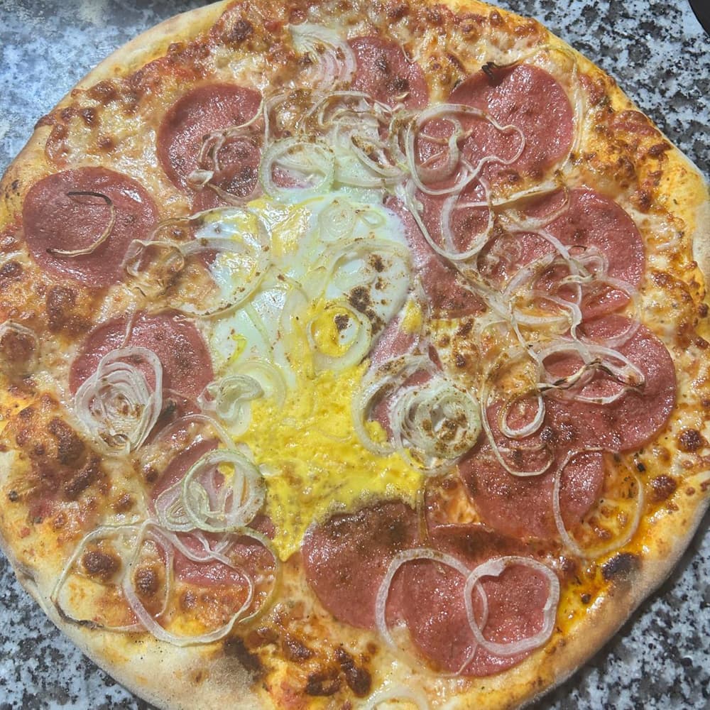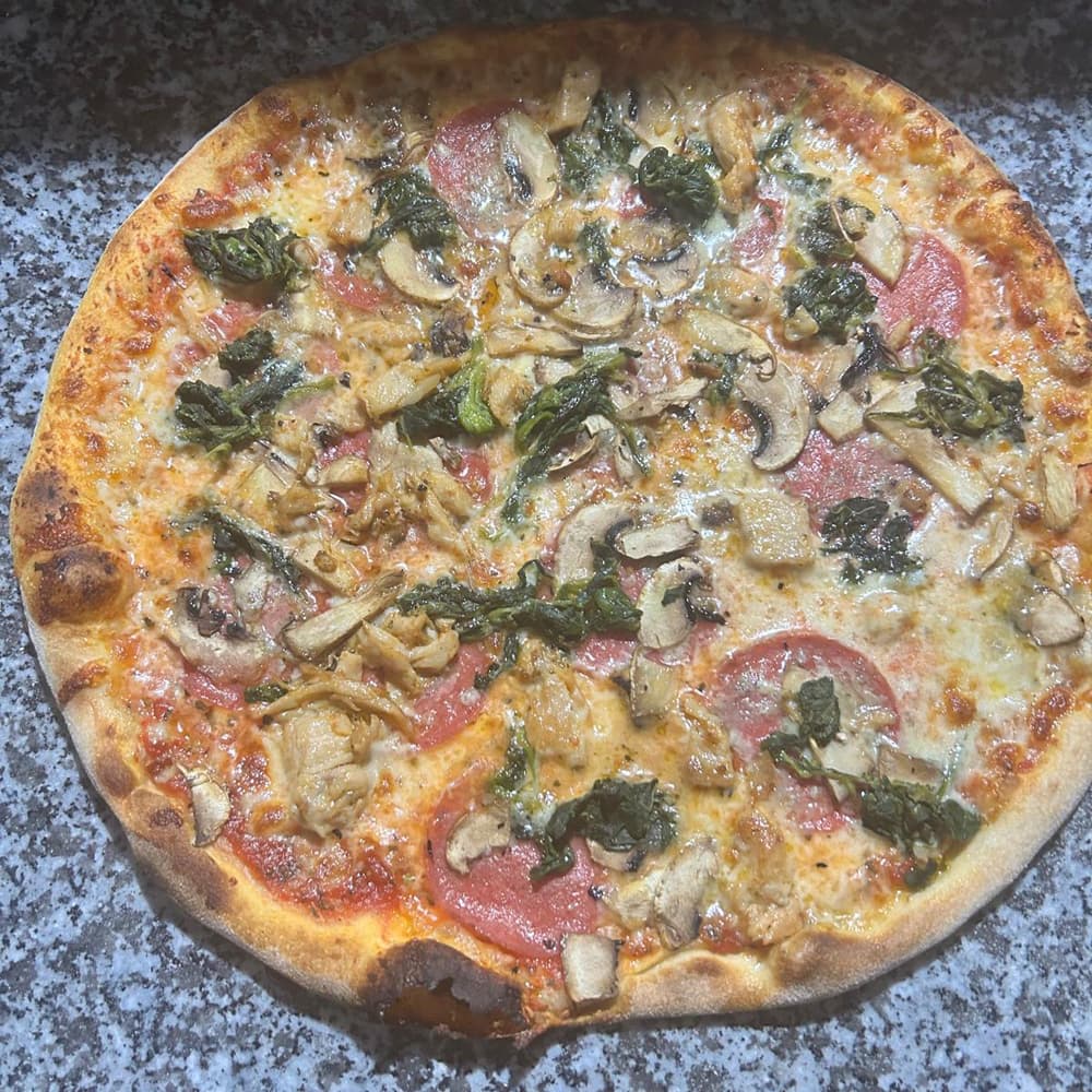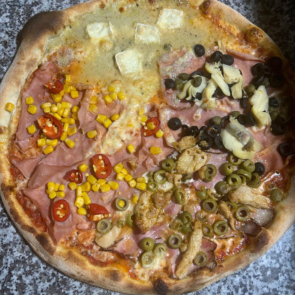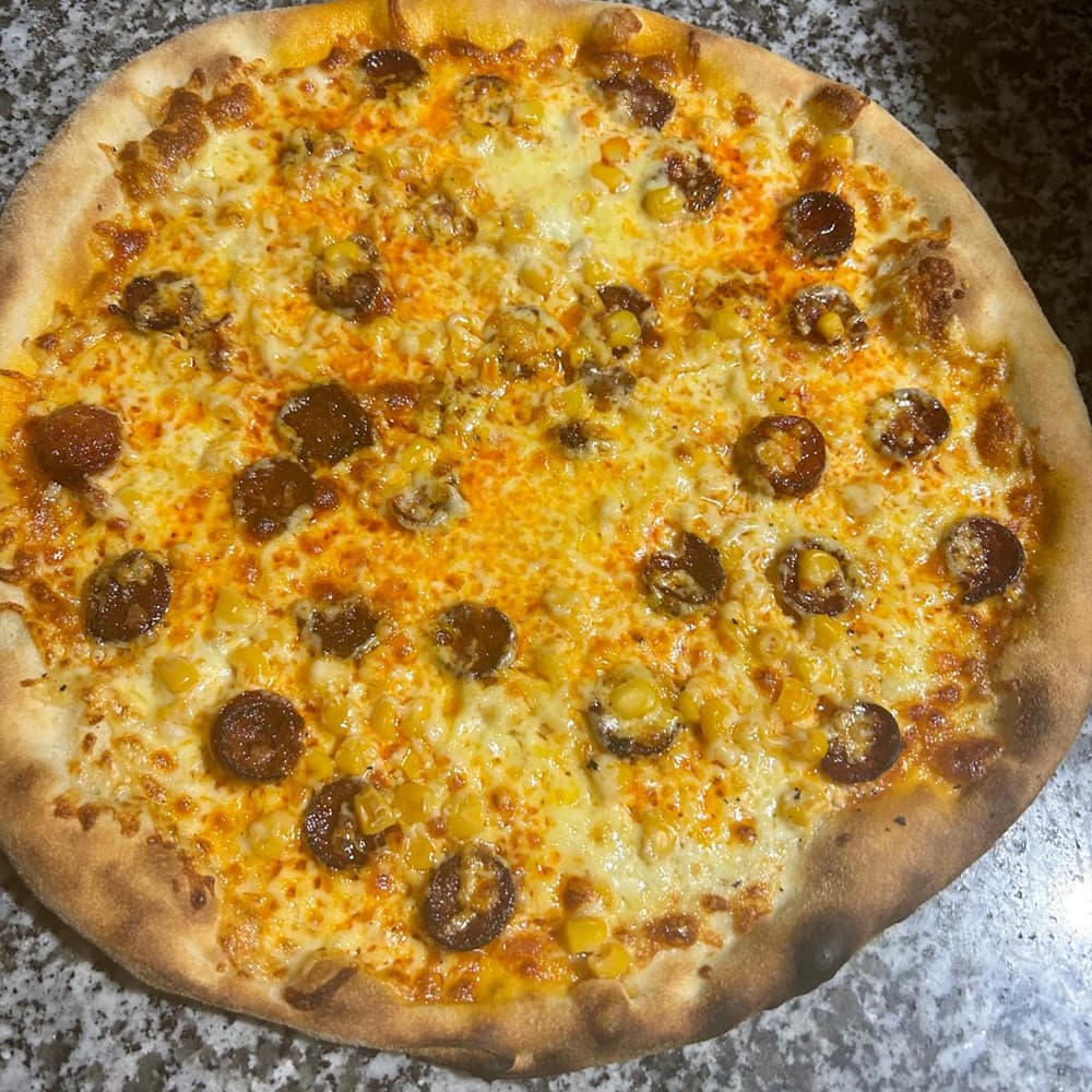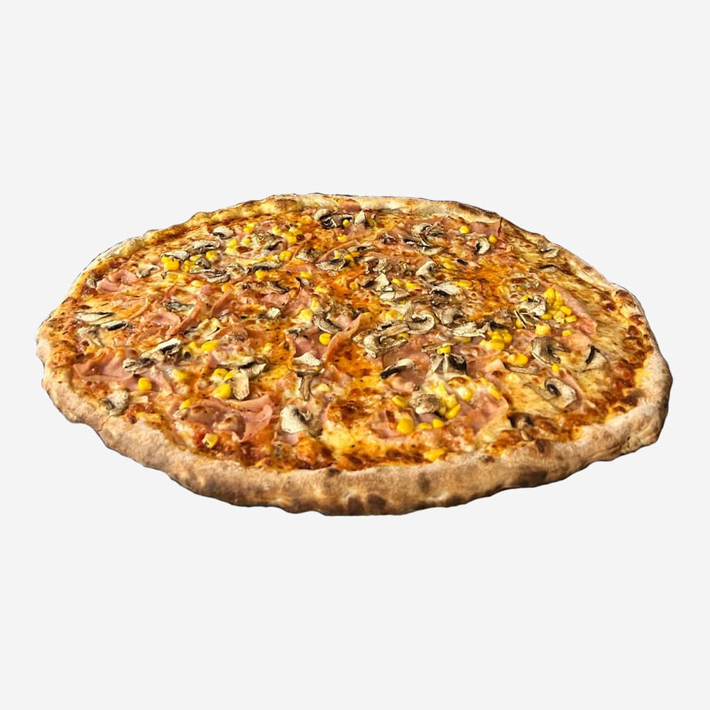 pomodoro, mozzarela, šunka, kukuřice, žampiony (velikostně je jako 3 naše běžné pizzy)