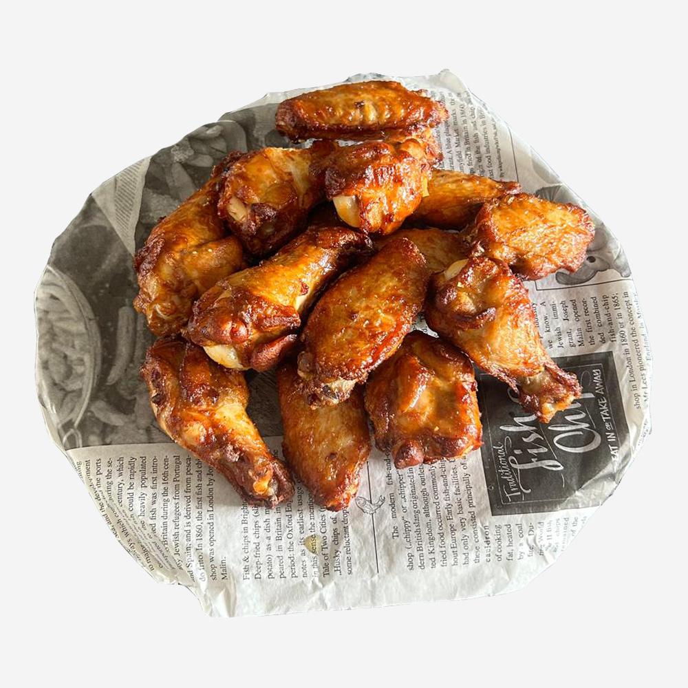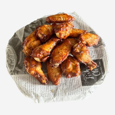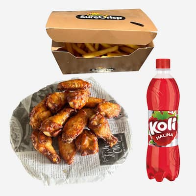 14 ks marinovaných křidélek, hranolky, 0,5 l Koli