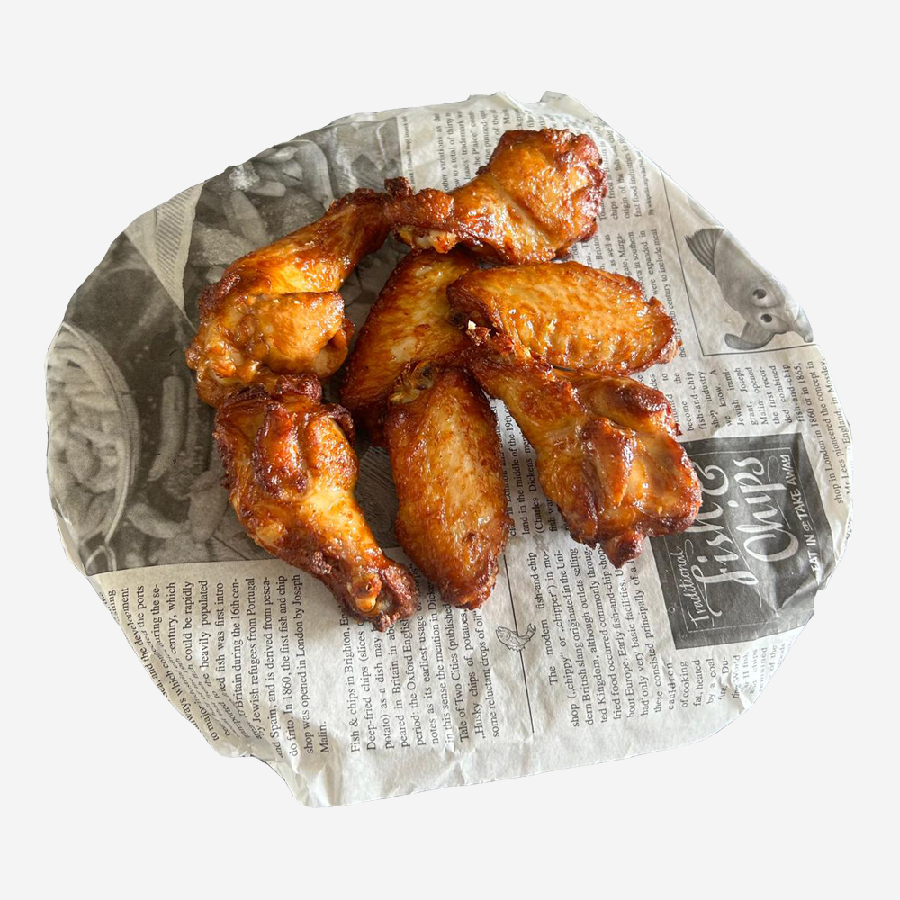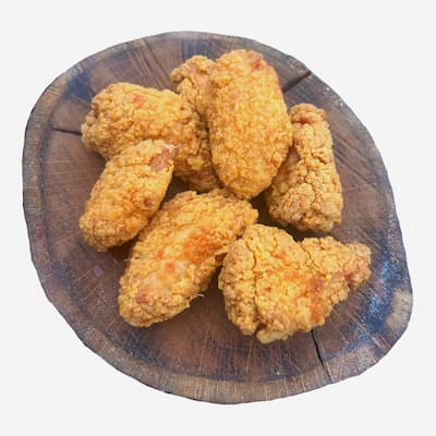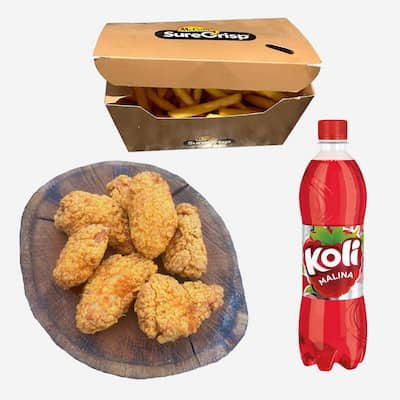 7 ks lehce pálivých dozlatova usmažených křídel, hranolky, 0,5 l Koli