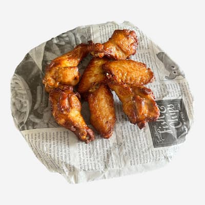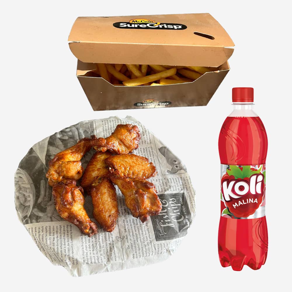 7 ks marinovaných křidélek, hranolky, 0,5 l Koli