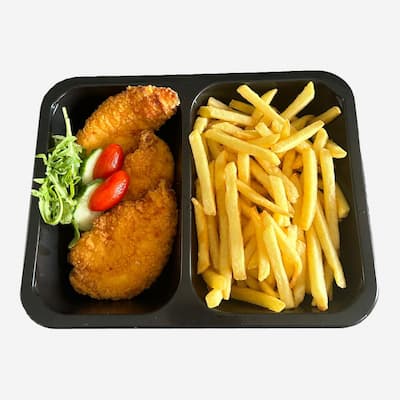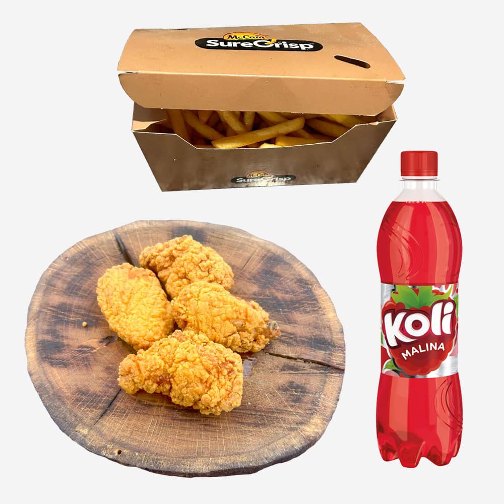 4 ks lehce pálivých dozlatova usmažených křídel, hranolky, 0,5 l Koli