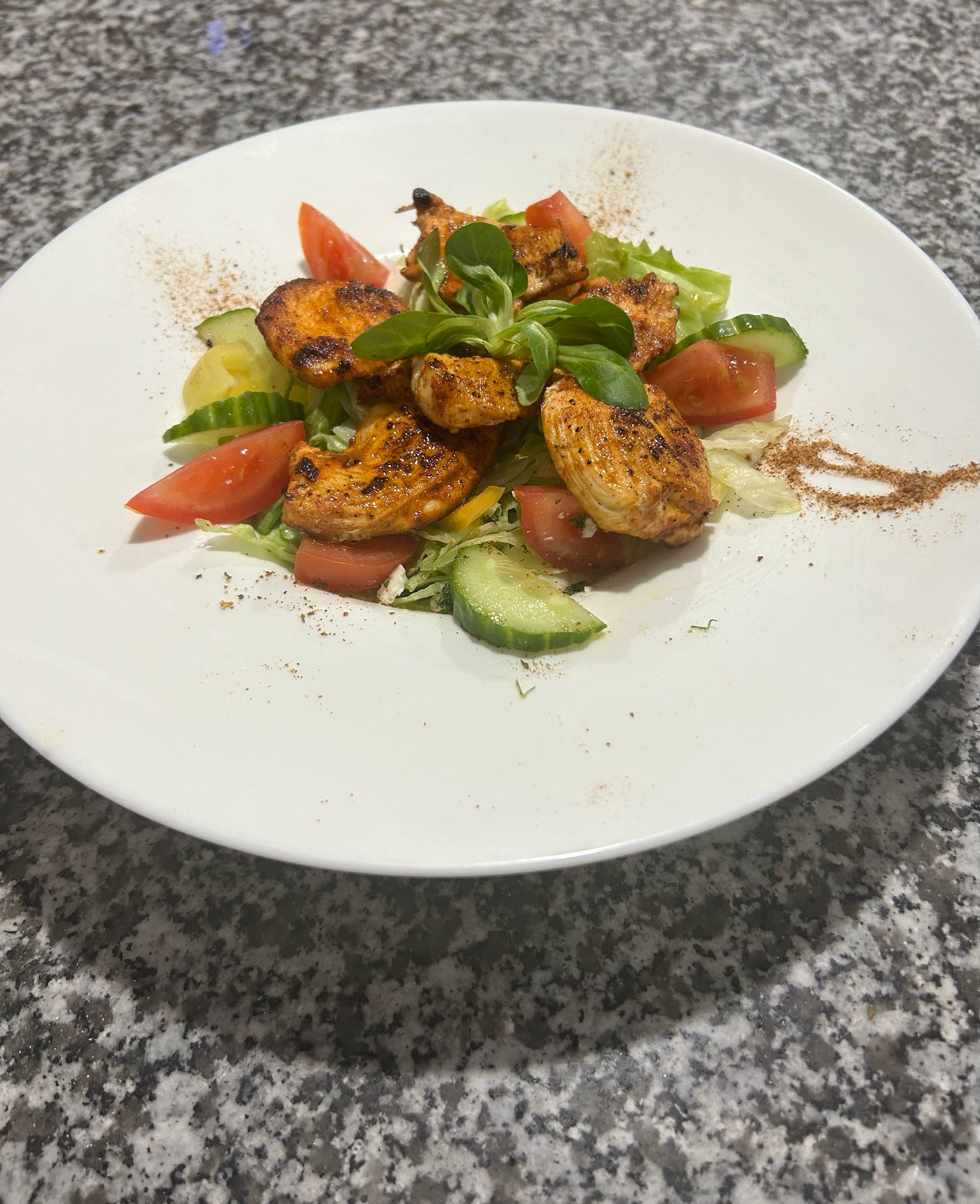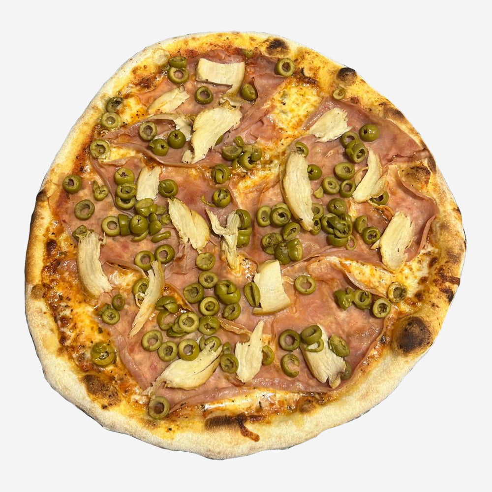 rajčata, mozzarella, šunka, kuřecí kousky, zelené olivy, ⌀ 33 cm