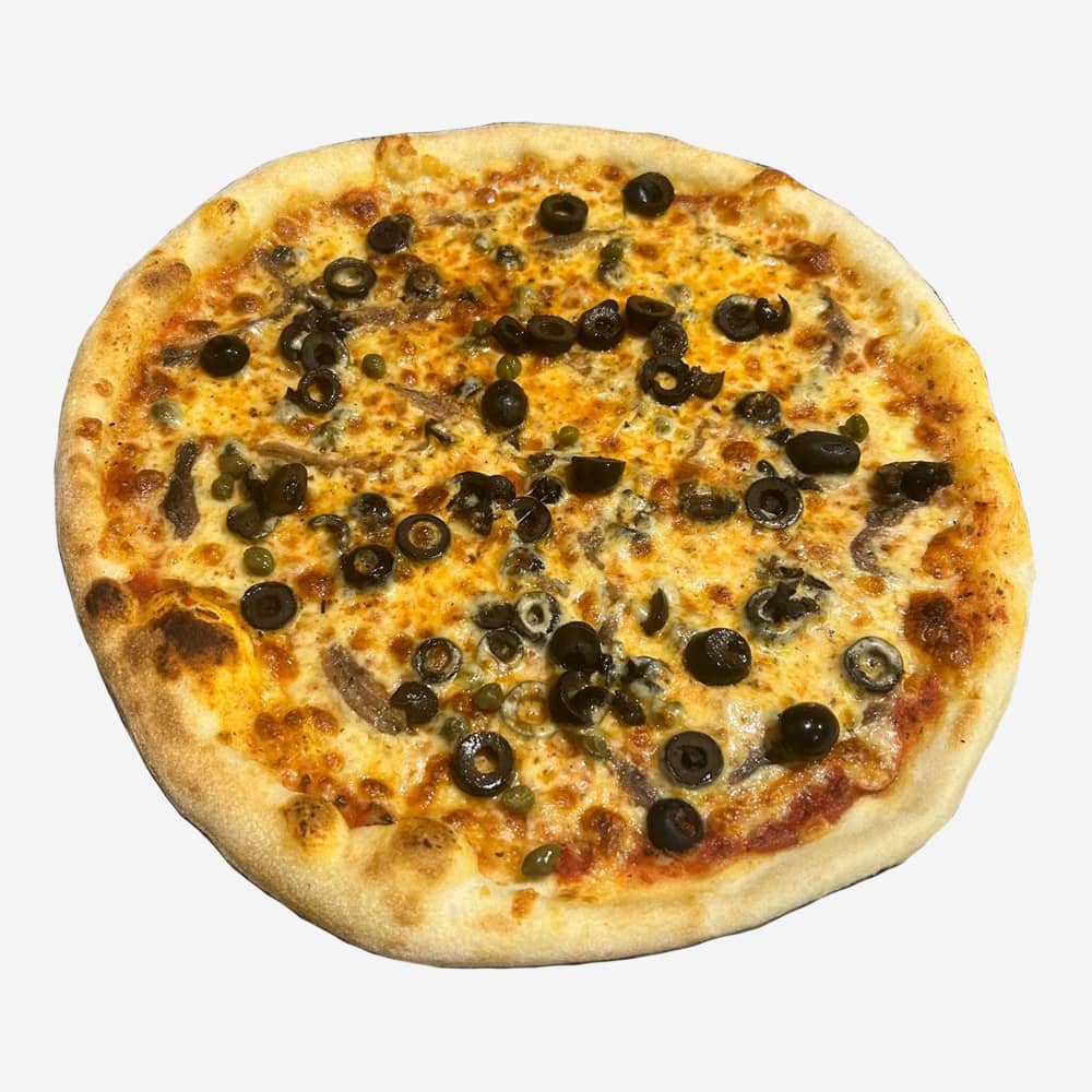 rajčata, mozzarella, ančovičky, černé olivy, kapari, česnek, ⌀ 33 cm