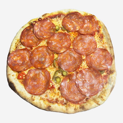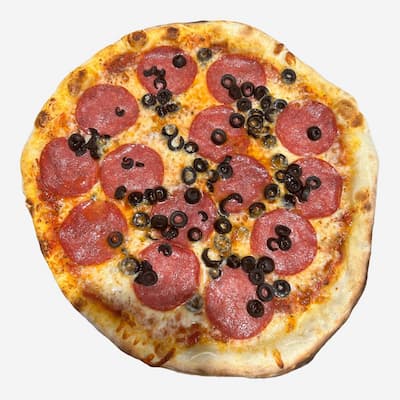rajčata, mozzarella, salám, černé olivy, ⌀ 33 cm